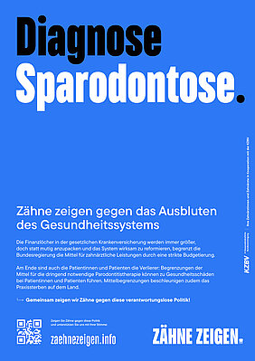 Innerhalb der nächsten drei Wochen erhalten Sie für Ihre Praxis Plakate, Postkarten, Flyer, Thekenaufsteller, Stempel und Buttons. Mit Slogans wie "Diagnose Sparodontose" oder "Versorgung örtlich betäubt" machen die Materialien auf die drohenden Versorgungsprobleme aufmerksam. Zentrale Anlaufstelle der Kampagne "Zähne zeigen!" ist jedoch die Webseite zaehnezeigen.info, auf der sich Patienten informieren können. Dort haben sie auch die Möglichkeit, ihren Bundestagsabgeordneten Nachrichten zu senden, in denen sie darauf hinweisen, dass die Kostendämpfungspolitik der Patientenversorgung schadet und beendet werden muss. Flankiert werden diese Maßnahmen von Social-Media-Aktivitäten unter dem Hashtag #zähnezeigen.