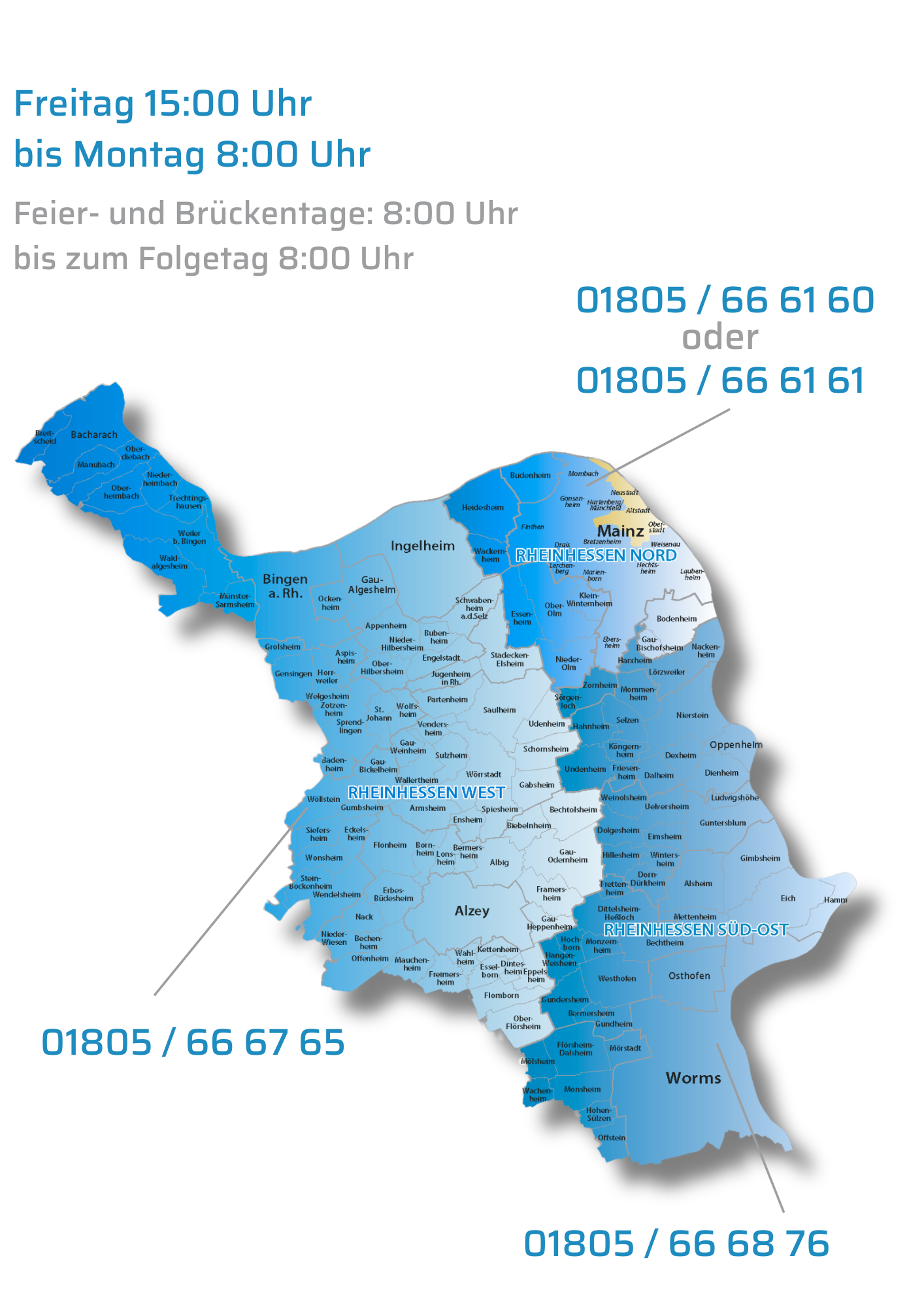 Patienten wohnhaft im Notdienstkreis Rheinhessen Nord (siehe Liste der Orte unten) erreichen den notdiensthabenden Zahnarzt zu den oben genannten Zeiten unter der Rufnummer