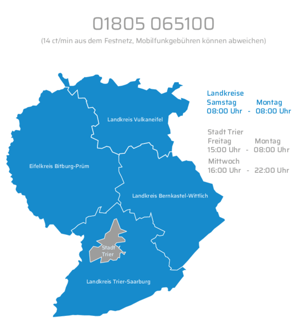 Der Notdienst im Eifelkreis Bitburg-Prüm sowie in den Landkreisen Bernkastel-Wittlich, Trier-Saarburg und Vulkaneifel ist von Samstag früh 8:00 Uhr bis Montag früh 8:00 Uhr erreichbar.