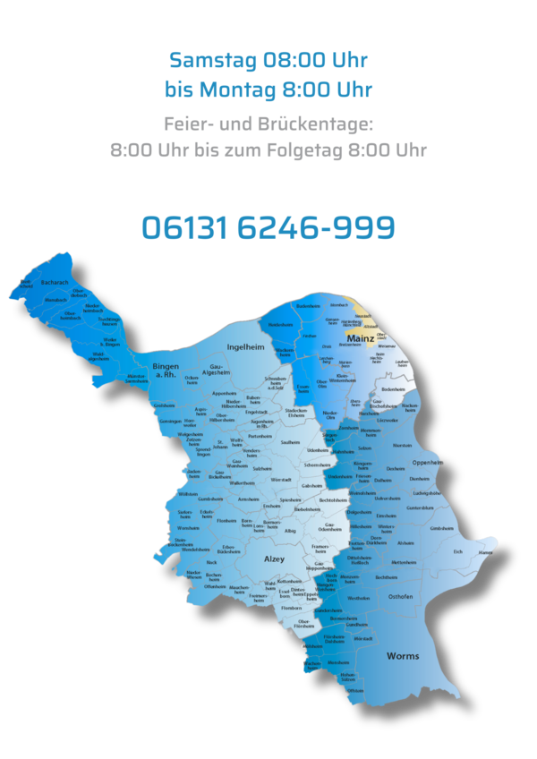 Der Notdienst in Rheinhessen ist von Samstag 8:00 Uhr bis Montag 8:00 Uhr für unvorhergesehene und dringende Notfallbehandlungen eingerichtet.