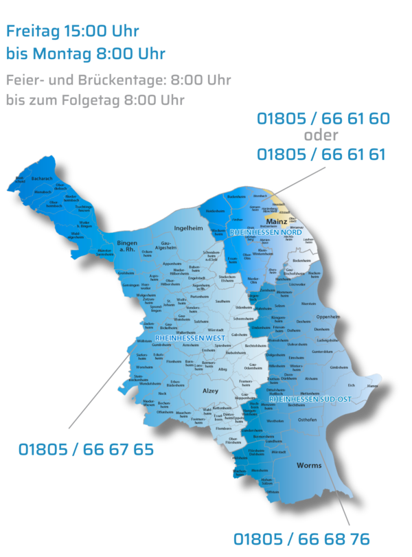 Patienten wohnhaft im Notdienstkreis Rheinhessen Nord (siehe Liste der Orte unten) erreichen den notdiensthabenden Zahnarzt zu den oben genannten Zeiten unter der Rufnummer